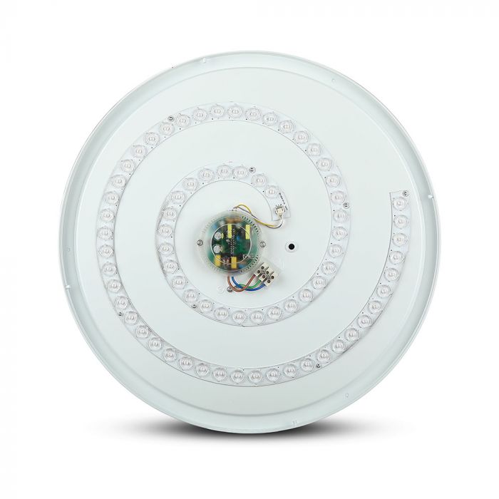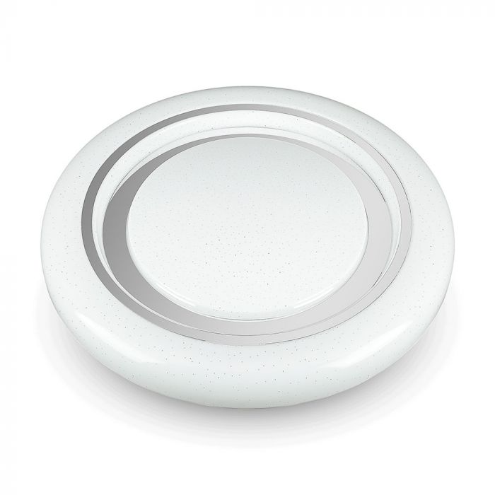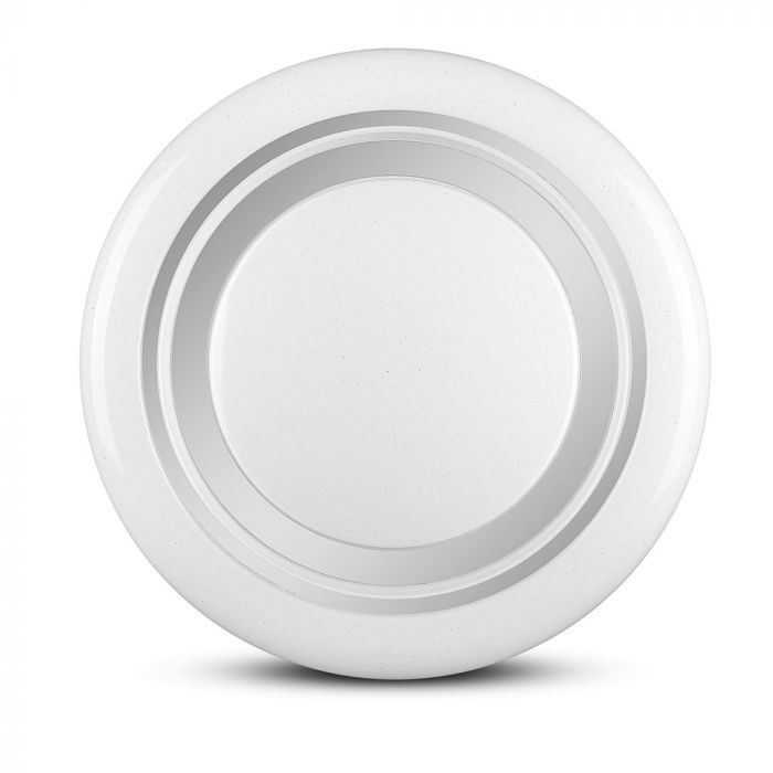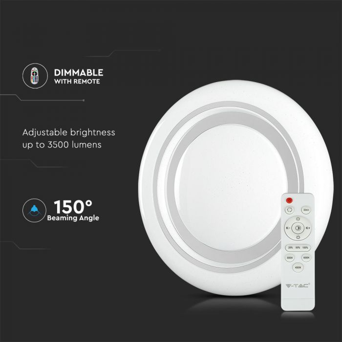 Plafoniera LED 65W con Fascio di 150° e Flusso luminoso di 3500lm. Colore bianco. Effetto cielo stellato. Telecomando in dotazione con funzione ON/OFF, dimmer, timer, luce di cortesia e impostazione della temperatura colore della luce bianca. Dimensioni:Ø480x75mm.